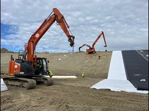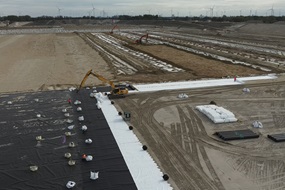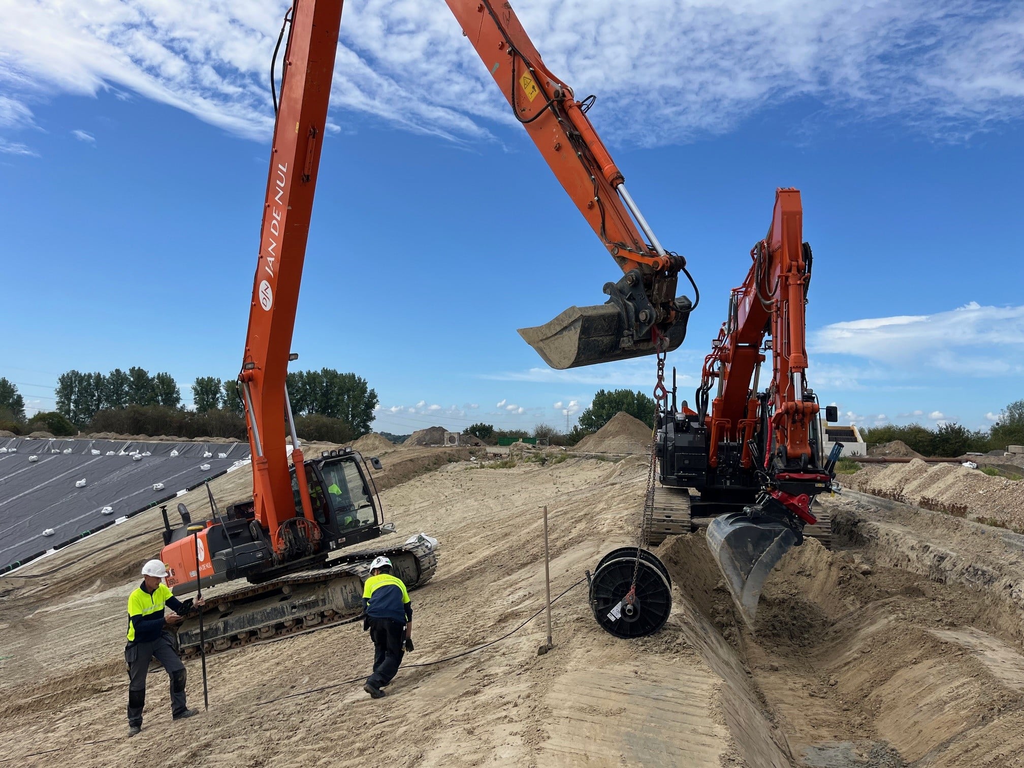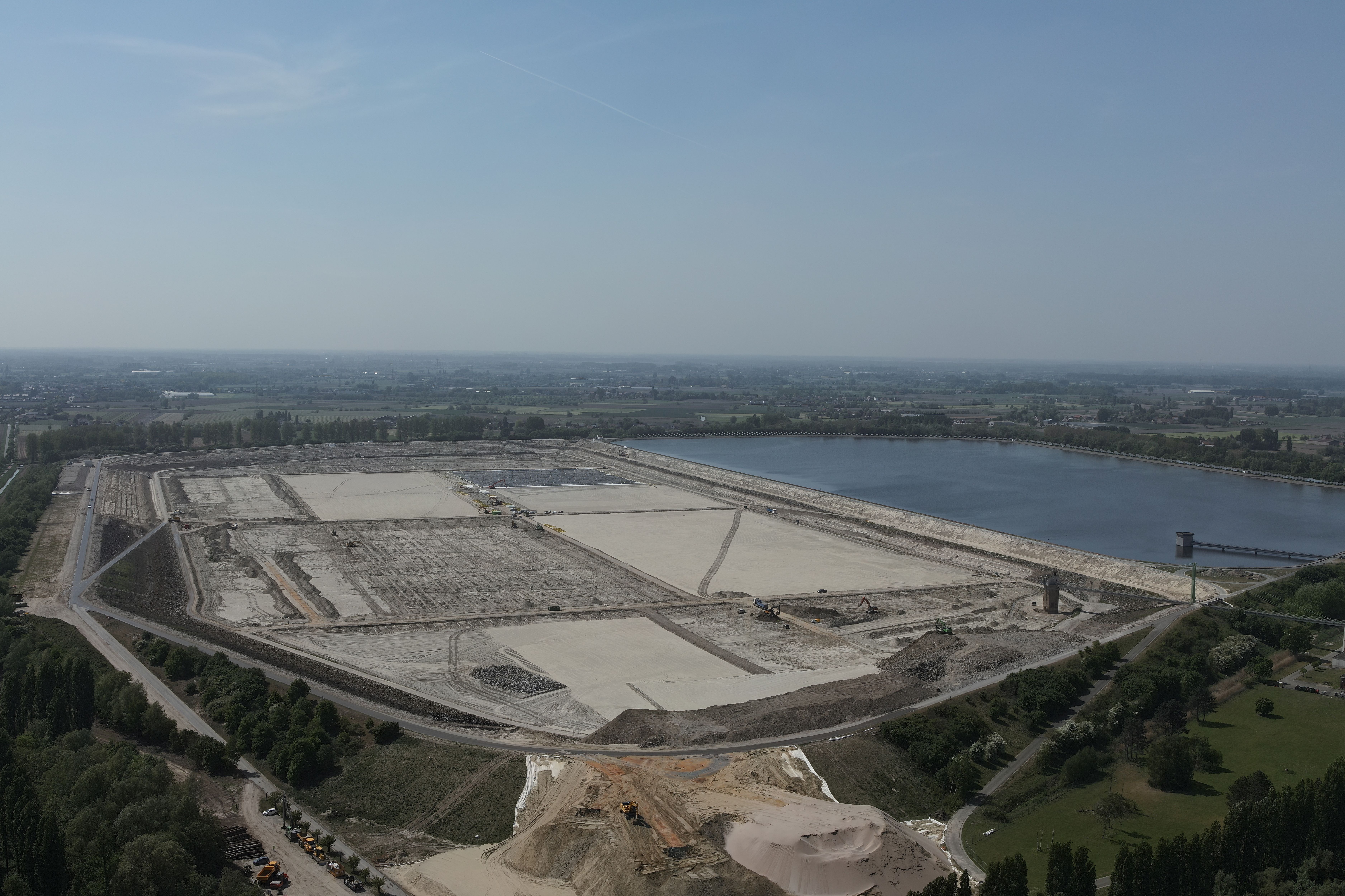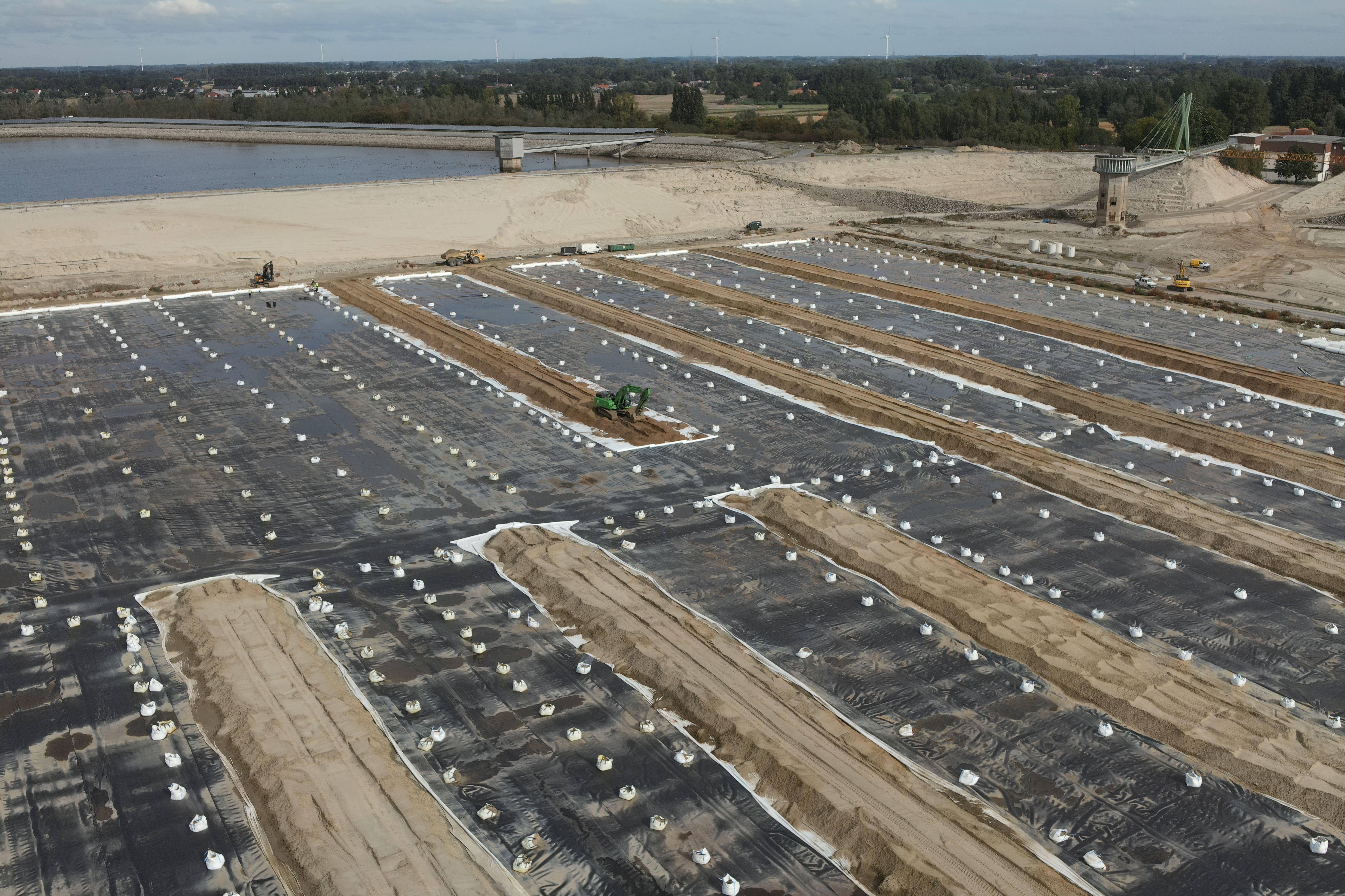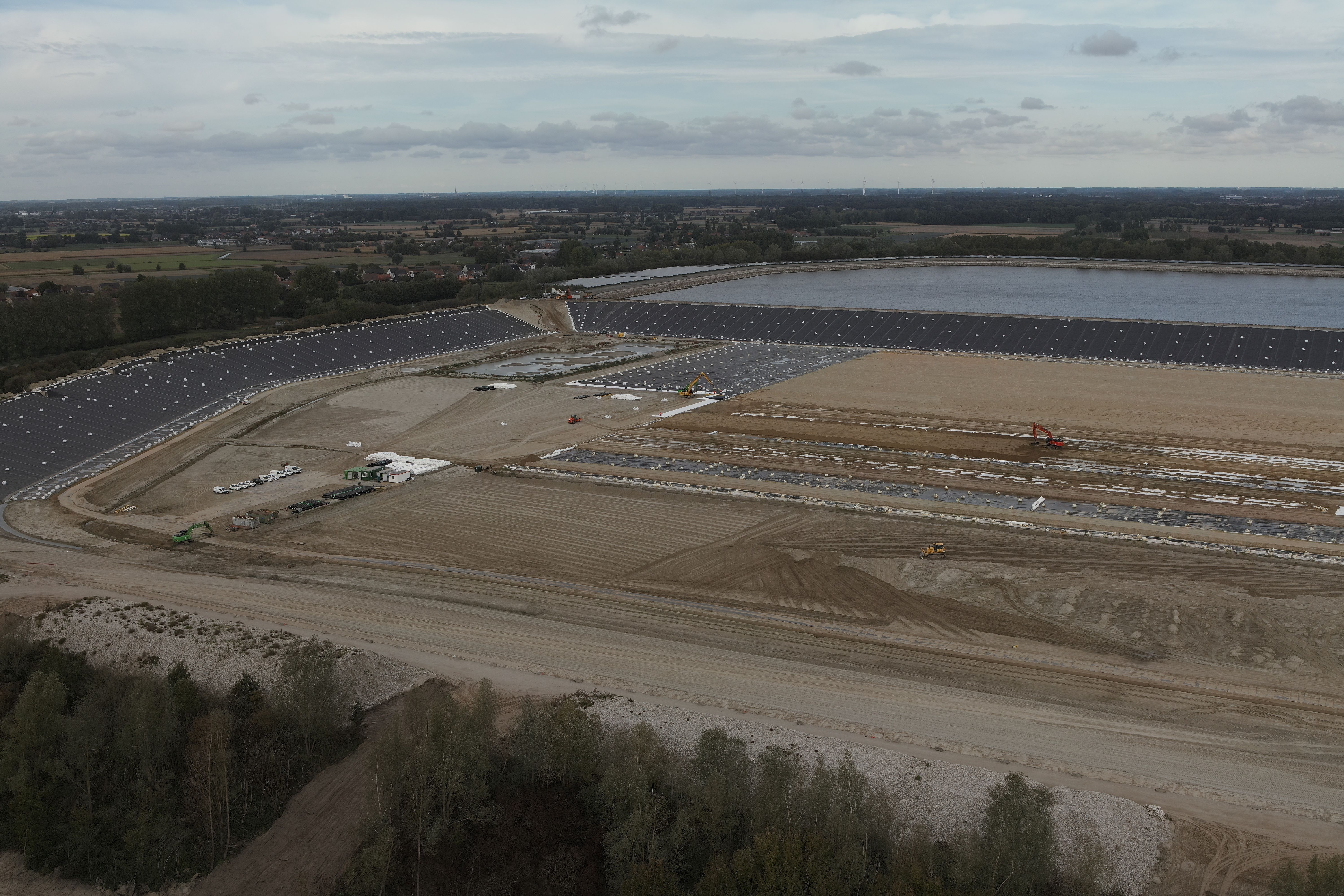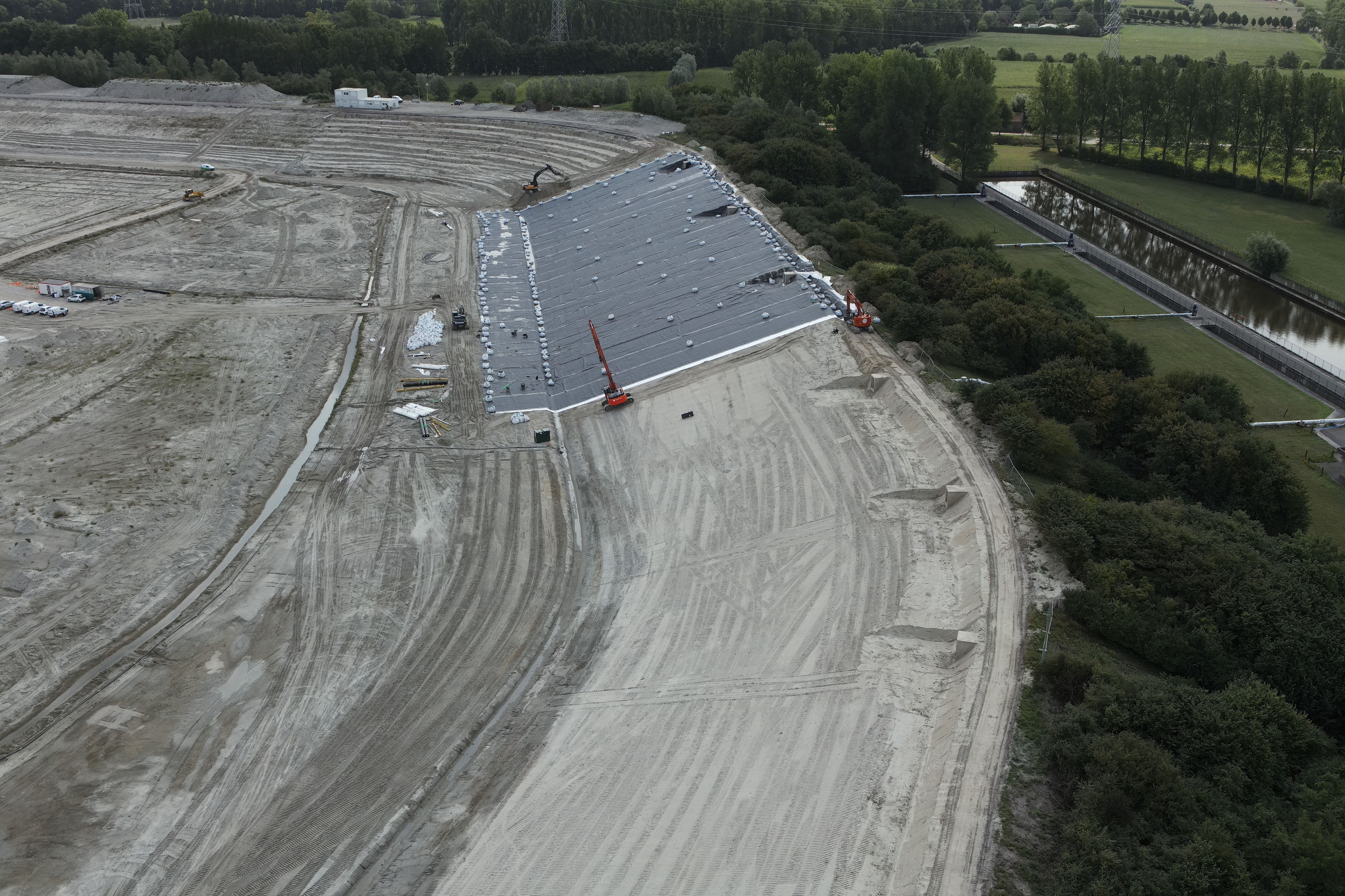 De werken aan het waterspaarbekken in Kluizen gingen van start in de lente van 2024 en schieten goed op. De folie op de bodem van het spaarbekken was aan vervanging toe. We installeren een nieuwe, dikkere folie met lekdetectiesysteem, een belangrijke investering voor een duurzame en klimaatrobuuste drinkwaterproductie. Door de jaren heen is er ook heel wat fosfaatrijk slib verzameld op de bodem van het spaarbekken. Dat veroorzaakte in de zomer algenbloei en bemoeilijkt de drinkwaterproductie. Het slib werd intussen grotendeels afgevoerd en vervangen door nieuw zand.